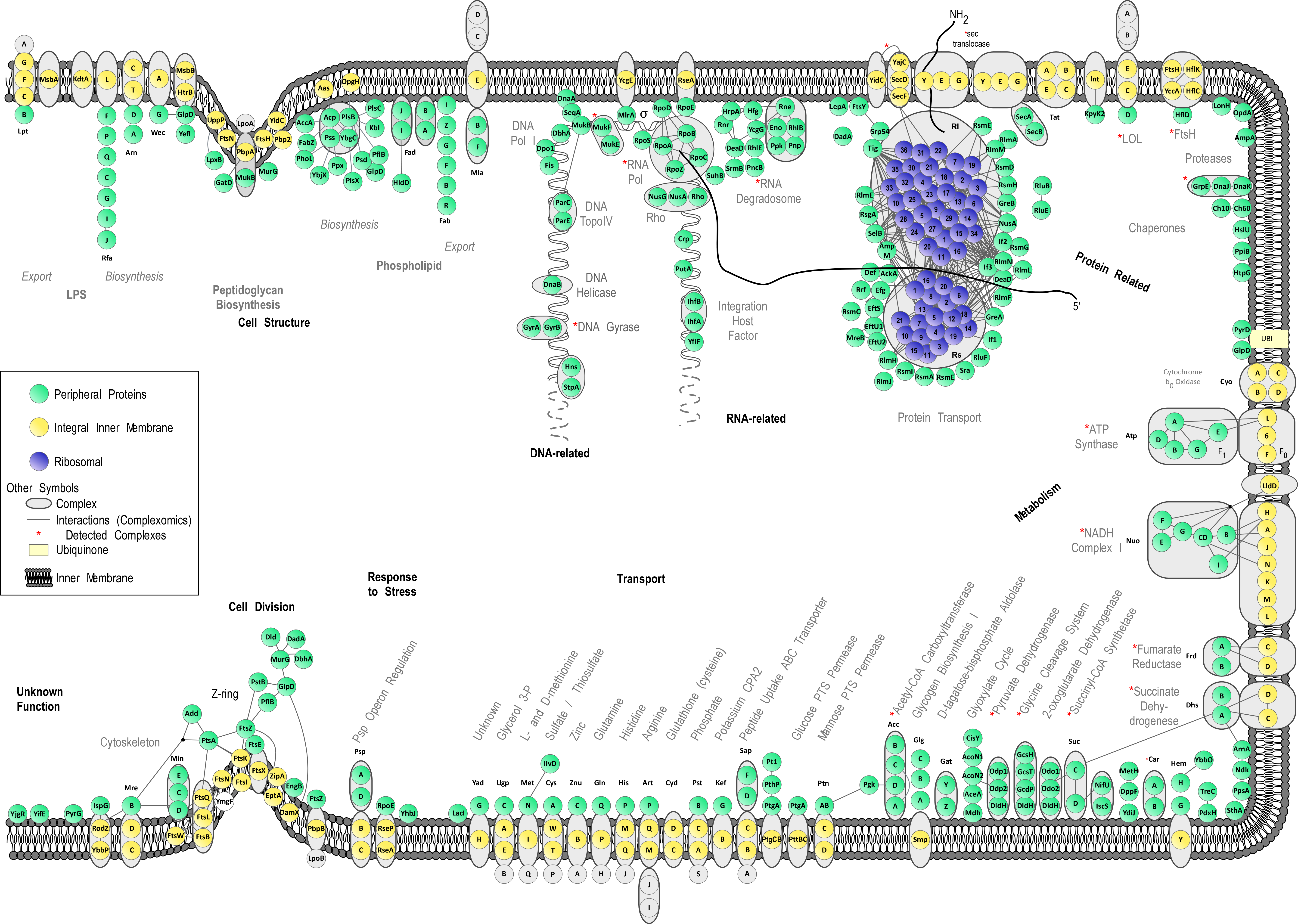This is a schematic longitudinal section of an E. coli dividing cell. A section of the inner membrane is depicted; the rest of the cell envelope is omitted for simplicity. Based on MultiFun classification Peripheral Inner Membrane proteins (PIM proteins, green circles) participate in 9 cellular processes (indicated with bold letters): cell structure; DNA-, RNA- and protein related; metabolism; transport; response to stress and cell division. Sub-categories of these processes are indicated with bold grey letters. The proteins are grouped according to known complexes (encircled in gray color schemes) and pathways, together with their integral inner membrane partners (yellow circles) where known (Keseler, I.M. [2009]). Protein-protein interactions derived from tandem-affinity purification experiments (Aranda, B et al [2010]) are also mapped (where available) and depicted with connecting lines. For visualization purposes the protein-protein interactions were integrated and loaded in Cytoscape (Keseler, I.M. [2009]).