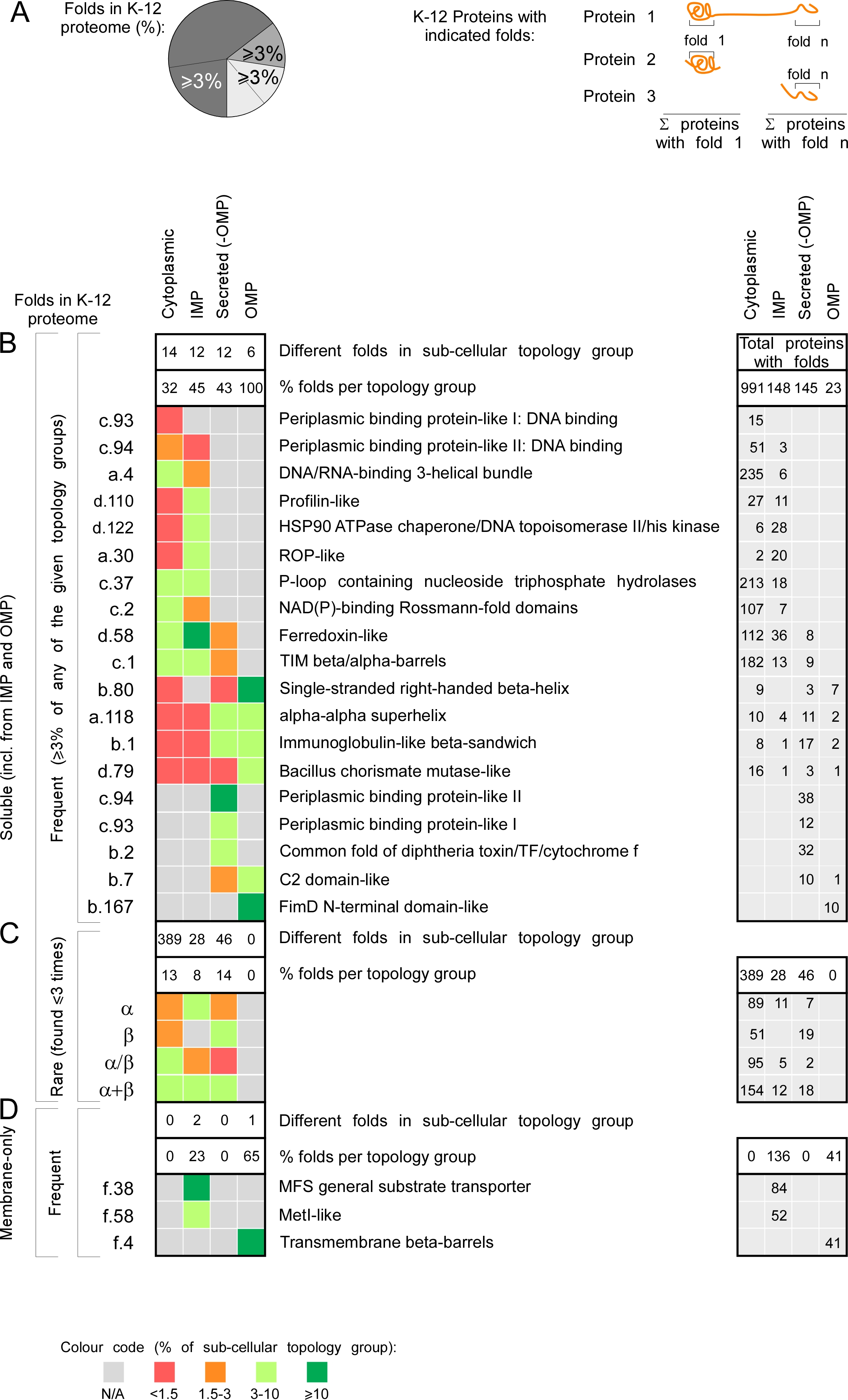 A. Left: cartoon representation of percentages depicted in the heat map (B, C, D on the left). Percentage of folds that represent ≥3% of all the folds found in each topology class (cytoplasmome, IMP, secretome without OMPs or OMPs). Such folds are included in panel B and D. Right: cartoon representation of the numbers depicted in the table on the right. Each number is how many proteins were found having the respective fold. Empty cells when no proteins were found with that fold.